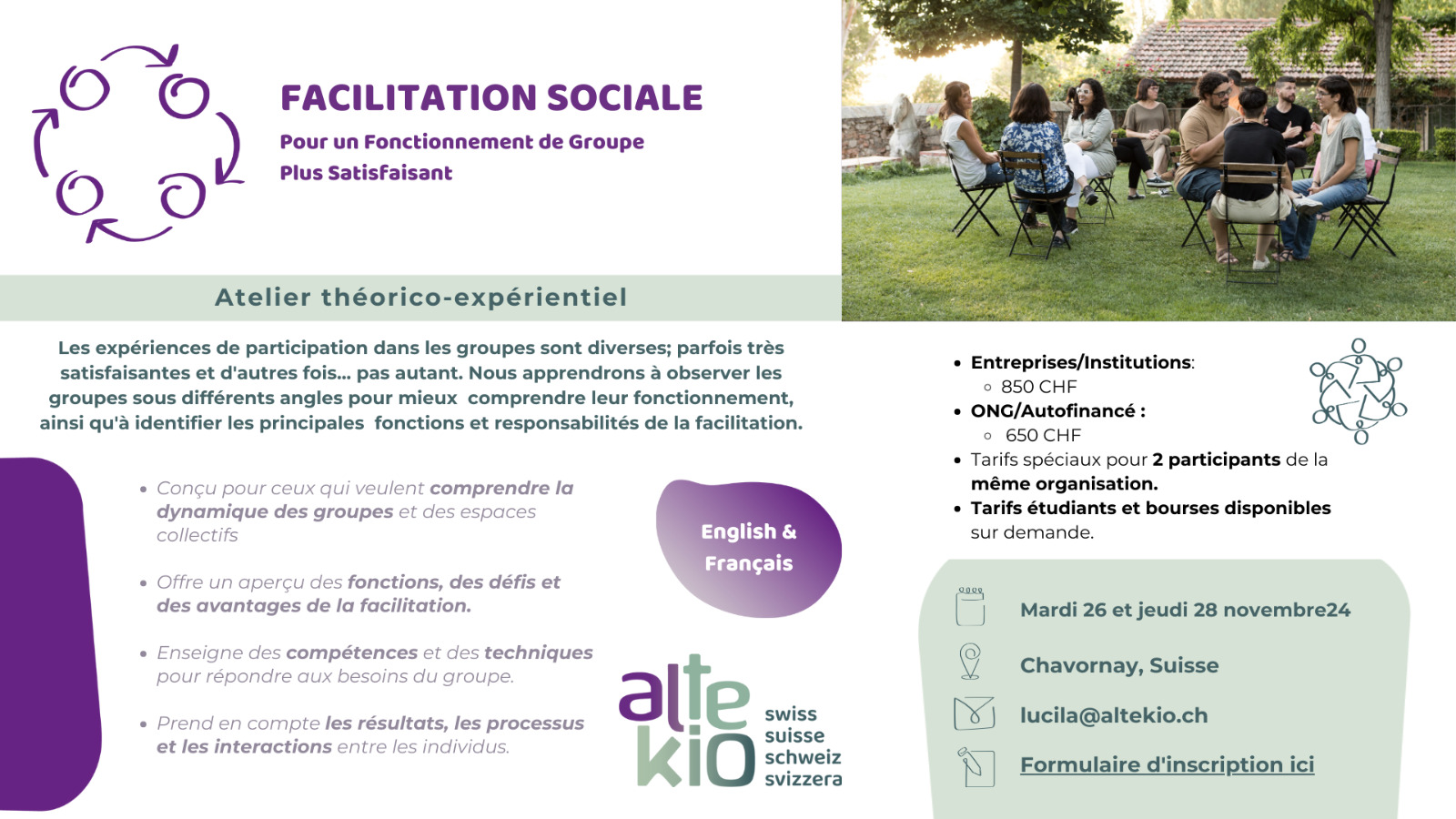 L’objectif principal du cours est de fournir un aperçu complet des fonctions, des défis et des avantages de la facilitation dans diverses organisations et groupes. Tout au long de la formation, les participants acquerront des compétences et des techniques pour répondre aux besoins du groupe, en tenant compte à la fois des résultats et des processus, ainsi que des relations et des interactions entre les in- dividus.
